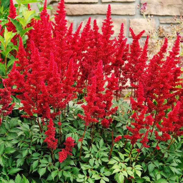 Bright red plumes are presented upright spires. Blooms early summer, one of the earliest reds to bloom. Foliage is mahogany red sprg, turng green by summer. One of the most popular reds, a vigorous grower. A member of Atilbe arendsii (Hybrid Astilbe/False Spirea). A group of hybrids developed by famed German nurseryman George Arends. cludes crosses between A. chensis davidii with A. astilboides japonica and A thunbergii