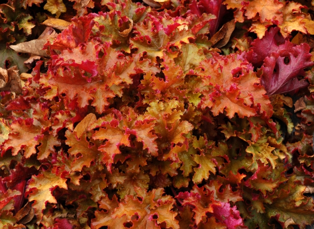 You will love Heuchera 'Zipper' with its brightly colored, seriously ruffled leaves. 'Zipper' leaves are well-colored all year and change from orange in spring and fall to golden amber in summer and winter, always with its magenta backs showing. This ruffle was bred with H. villosa which gives the larger leaf size, better heat and humidity tolerance. The ruffle breeding gives the good cold tolerance.